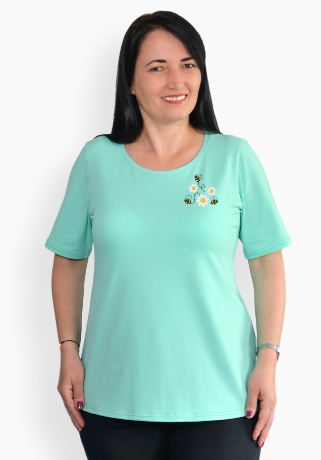 Un tricou stil bluza, cu manecile deasupra la cot, decolteu potrivit, asortat cu broderie margarete si albinute.